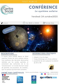 A travers cette balade depuis le Soleil jusqu'aux limites de notre système solaire, nous parlerons des dernières découvertes réalisées par les sondes spatiales et notamment des recherches de la vie extraterrestre.