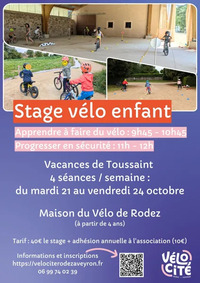 vacances de Toussaint : du mardi 21 au vendredi 24 octobre de 9h45 à 10h45 (hors jeudi : cours déplacé l’après-midi à 14h). Inscription sur https://velocite-rodez-aveyron.assoconnect.com/collect/description/609488-j-stage-j-apprends-a-faire-du-velo-toussaint-2025