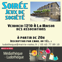 La Médiathèque-ludothèque de Rodez vous propose une soirée jeux à la Maison des Associations de Rodez le vendredi 17 octobre 2025 à 18 heures.