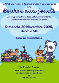 Bourse aux jouets par l'APEL Jeane d'Arc Rodez, à la salle des fêtes.