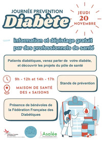 Le pôle de santé Faubourg – 4 Saisons organise une journée de sensibilisation et de prévention consacrée au diabète, le jeudi 20 novembre 2025, de 9h à 12h et de 14h à 17h.