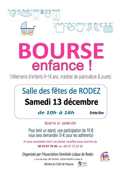 L’Association Familiale Laïque (A.F.L) du secteur de Rodez organise une BOURSE ENFANCE de vêtements d'enfants (0 - 16 ans), de matériel de puériculture et autres équipements. L'entrée est libre et gratuite pour toutes les personnes acheteuses Les personnes souhaitant tenir un stand individuel s'acquitteront de l'adhésion annuelle 2025 à l'association (10€) ou d'une participation de 5€ pour les adhérents 2025. L'inscription se fera par téléphone ou SMS (06.43.97.76.86 et 06.37.72.22.32) ou par mail (afl.rodez12@gmail.com).
